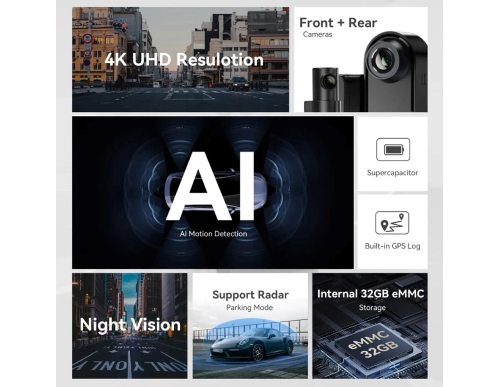 – The Al millimeter-wave radar monitors vehicle’s surroundings. Upon detection, the camera automatically records, saving 10 seconds of video.