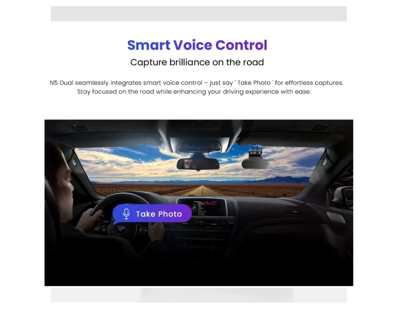 – N5 Dual seamlessly integrates smart voice control – just say ‘ Take Photo ‘ for effortless captures. Stay focused on the road while enhancing your driving experience with ease.
