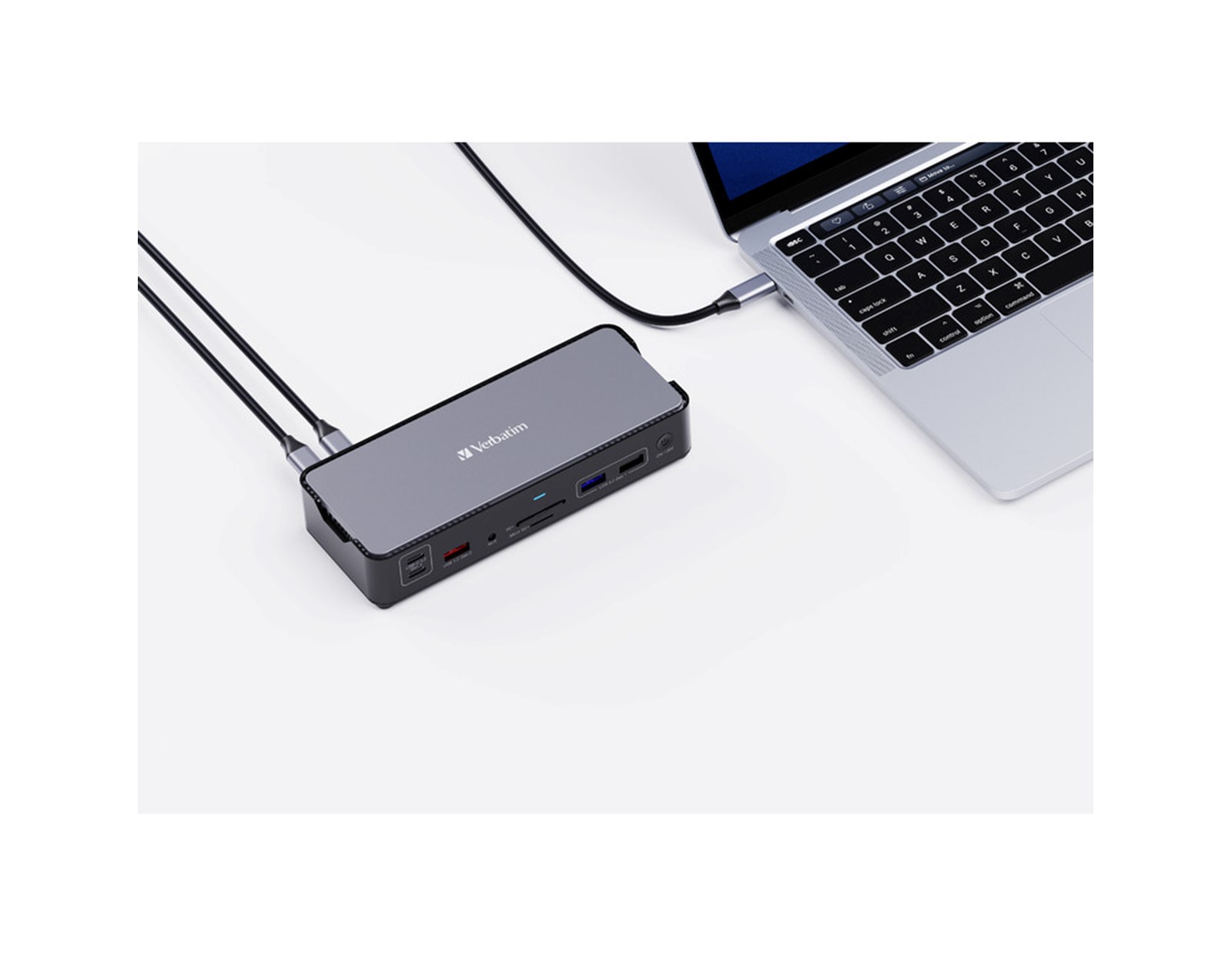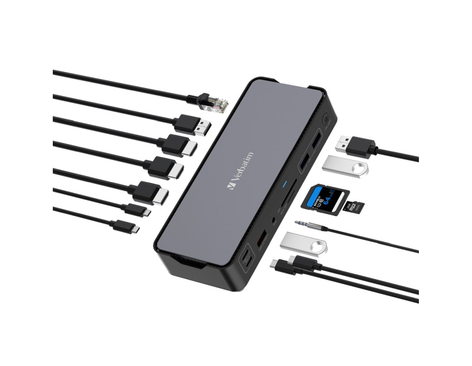 – Pojednostavite svoj radni prostor uz Verbatim USB-C Pro priključnu stanicu s 15 priključaka. Ovaj inovativni uređaj pojednostavljuje povezivanje konsolidacijom više priključaka u jedno elegantno rješenje. S jednim USB-C® priključkom otključajte potencijal petnaest svestranih priključaka, uključujući USB-A priključke raznih generacija, utore za SD i microSD memorijske kartice, audio priključak, RJ45 i DisplayPort veze, USB-C priključke i USB-C PD priključak za besprijekorno prolazno punjenje. Doživite budućnost uz podršku za 8K video izlaz na jednom zaslonu ili 4K razlučivost na tri zaslona.