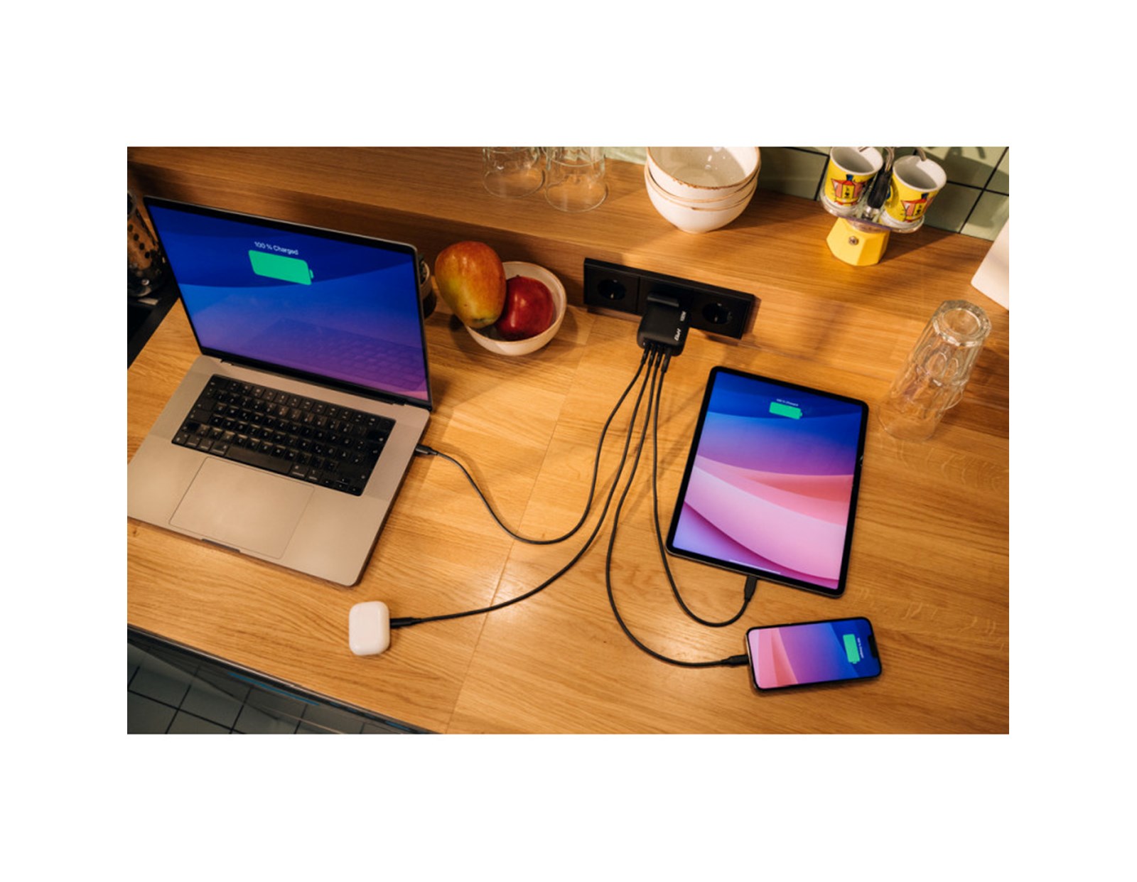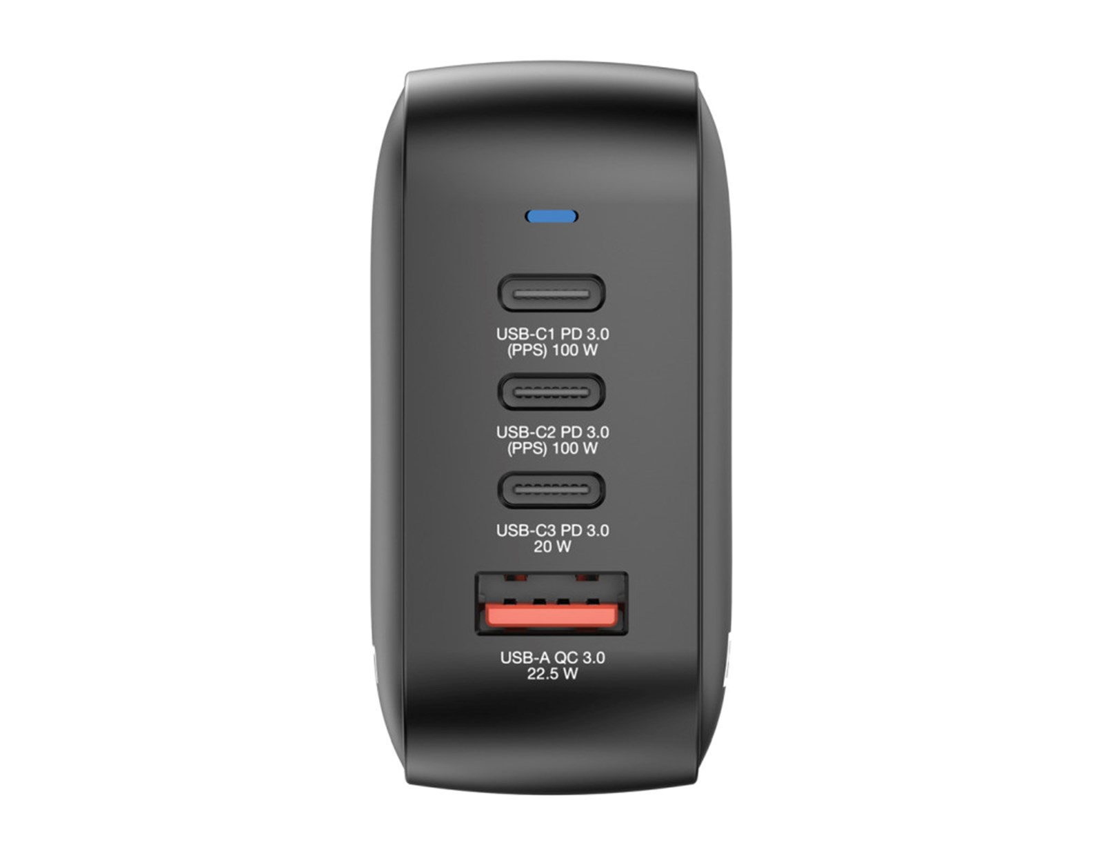– 100W mini wall charger with 4 output ports: 2 x USB-C® PD 100W, 1 x USB-C PD 20W and 1 x USB-A QC 3.0