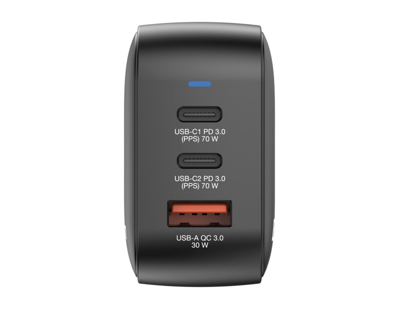 – 70W mini GaN wall charger with 3 output ports: 2 x USB-C® PD 70W and 1 x USB-A QC 3.0