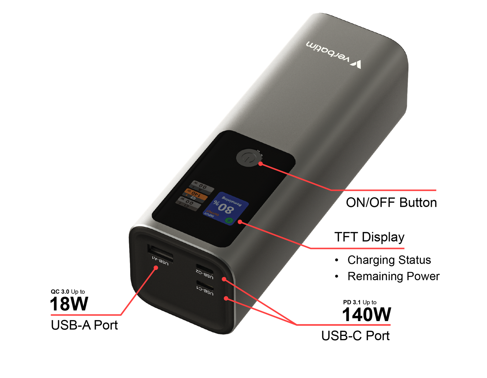 Verbatim Powerbank 27000mAH Charge ‘n’ Go 183W max, Dual USB-C® port, 1xUSB-A, Smart digital TFT display